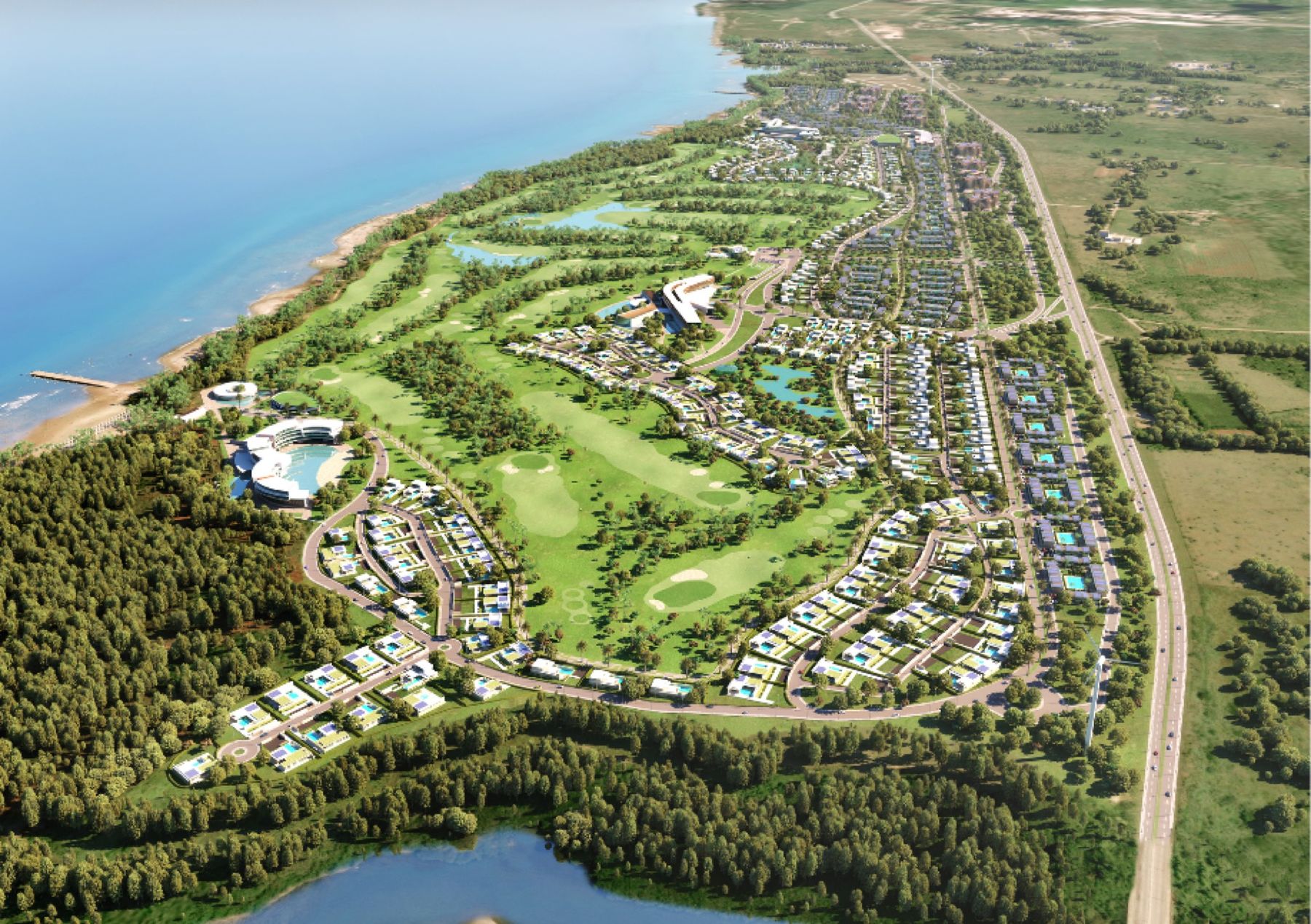 Campo da Golf (18 buche), Hotel 4 stelle (400 camere), Hotel 5 stelle (300 camere), Hotel di lusso 5 stelle (120 camere), Sala Conferenze (400 posti), Spa, Centro Commerciale, Parcheggio, 4 Ville sulla spiaggia, 2070 Appartamenti, 869 Ville, Area verde di 4.10 ha.