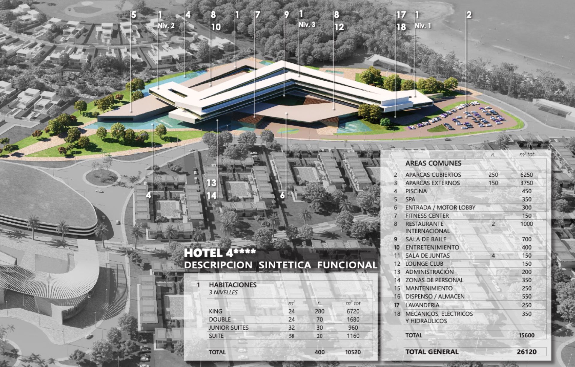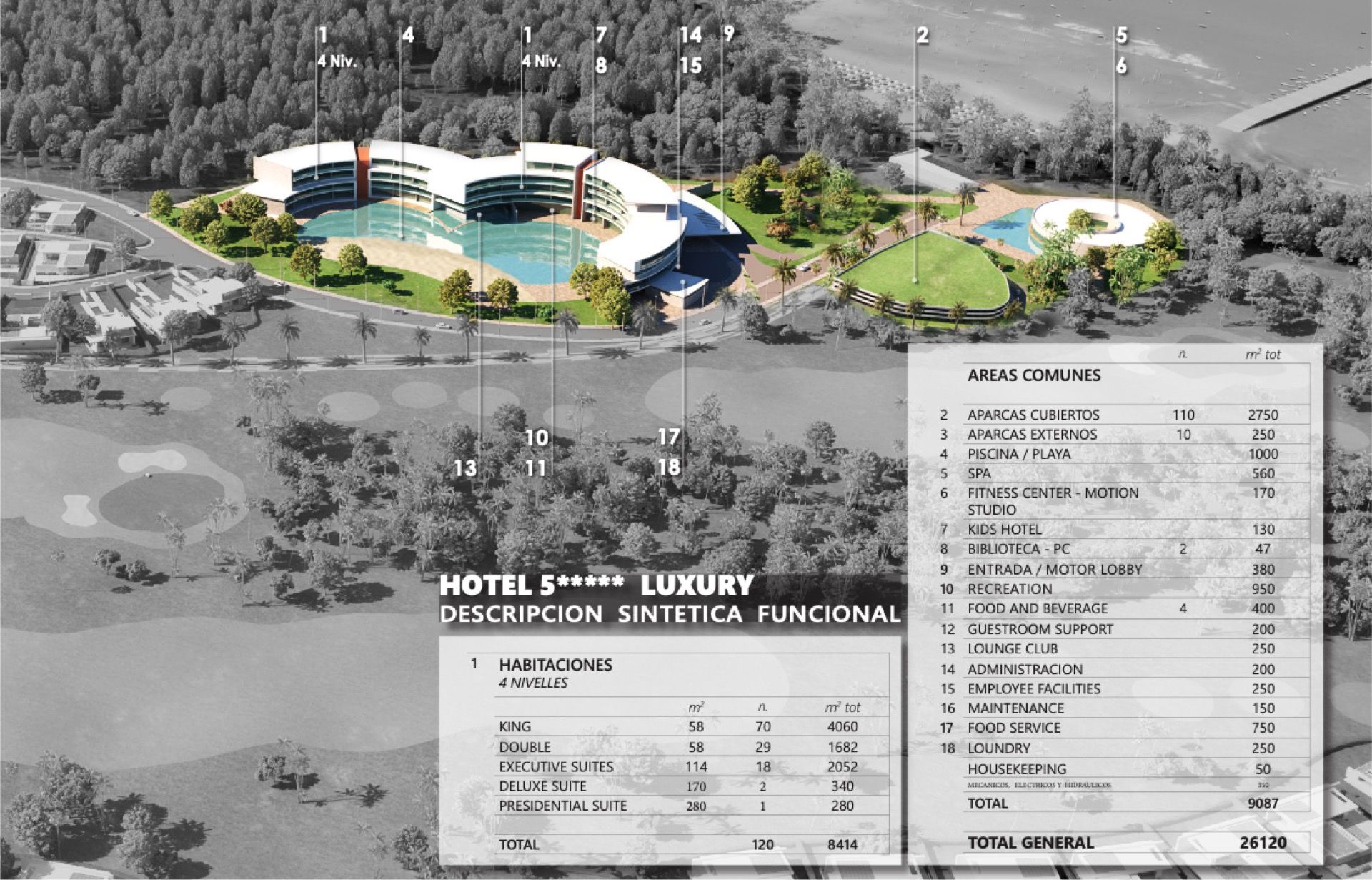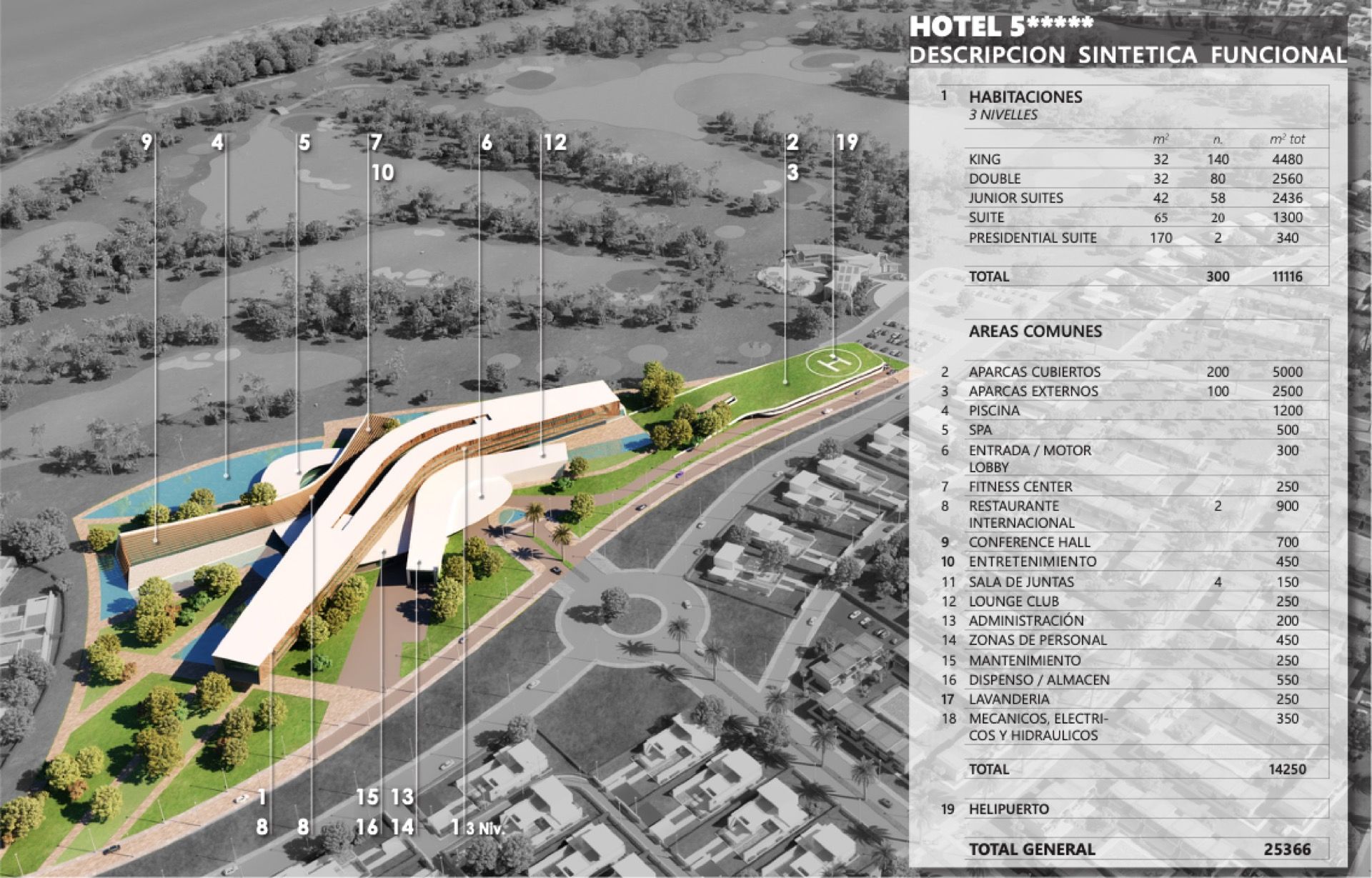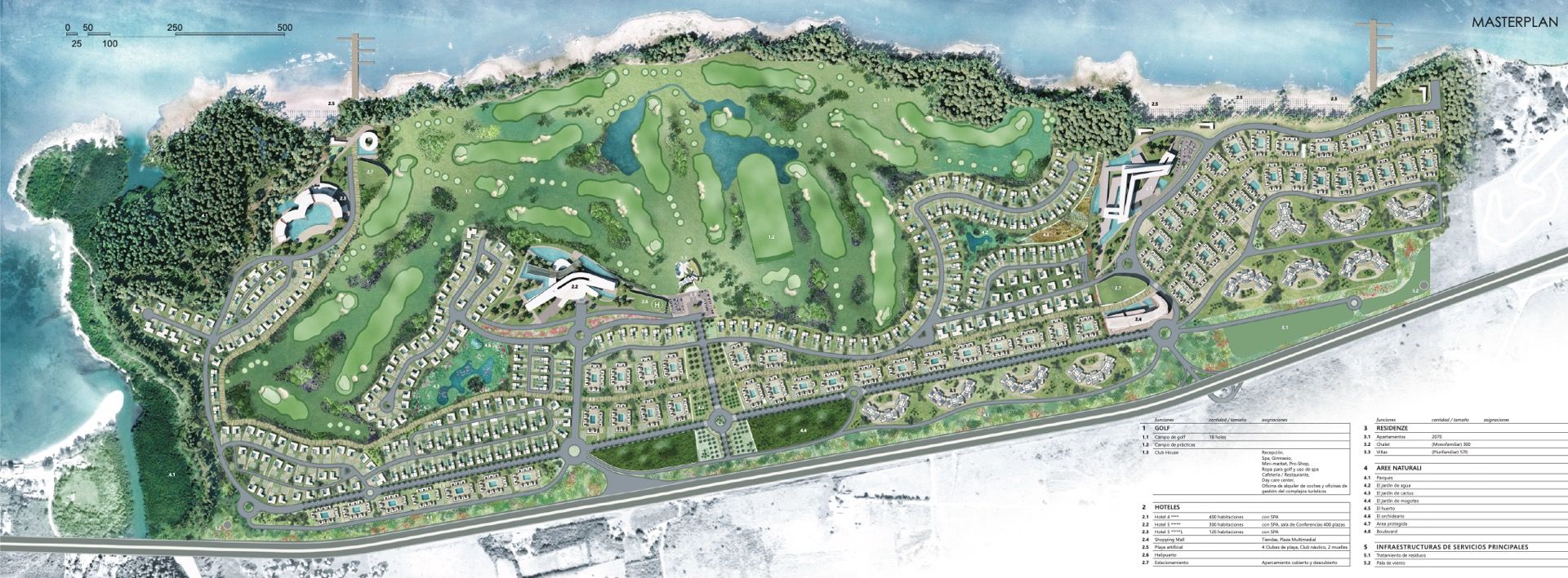 Campo da Golf (18 buche), Hotel 4 stelle (400 camere), Hotel 5 stelle (300 camere), Hotel di lusso 5 stelle (120 camere), Sala Conferenze (400 posti), Spa, Centro Commerciale, Parcheggio, 4 Ville sulla spiaggia, 2070 Appartamenti, 869 Ville, Area verde di 4.10 ha.