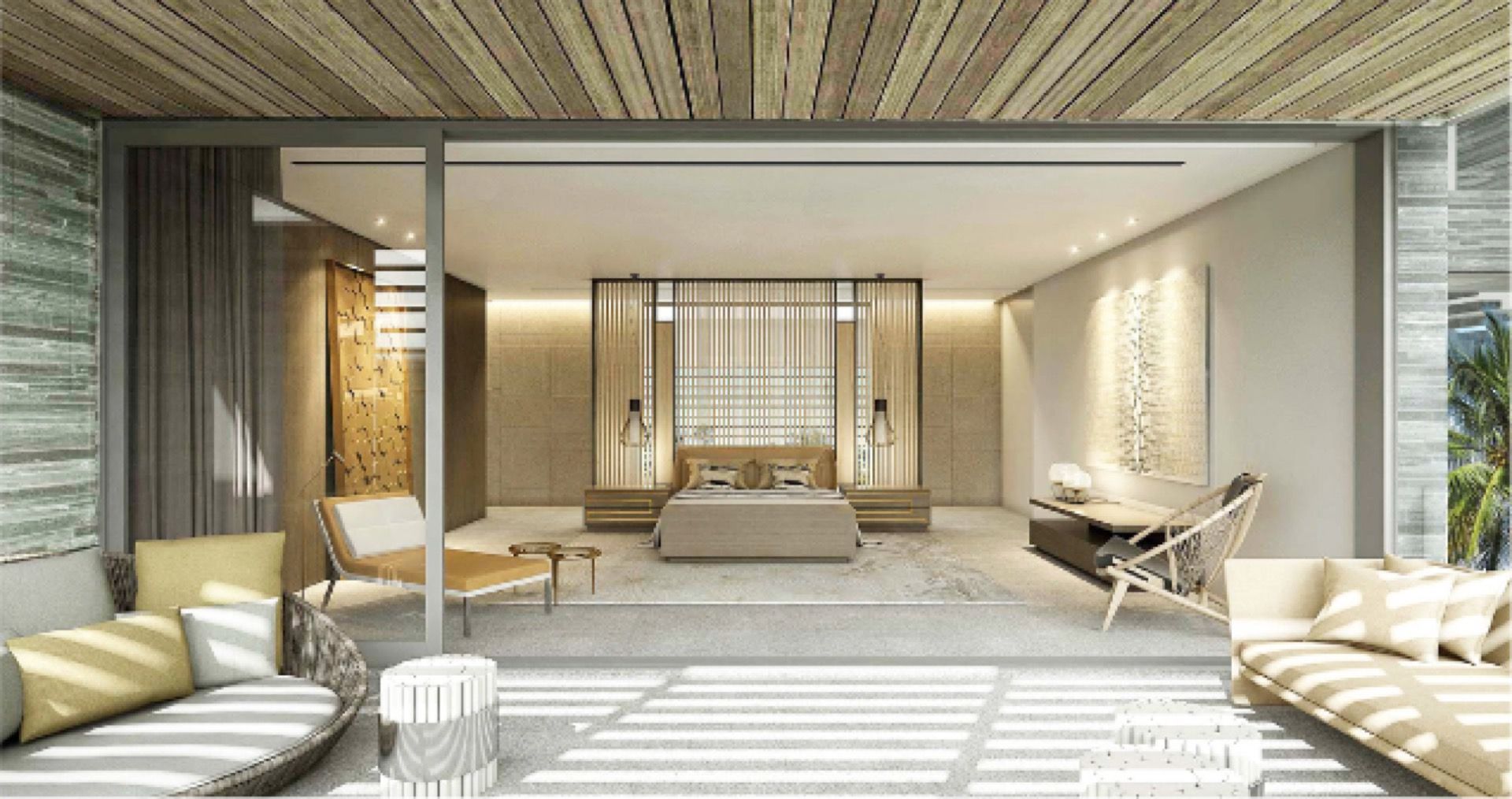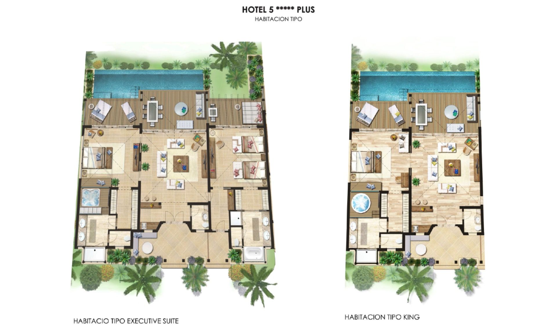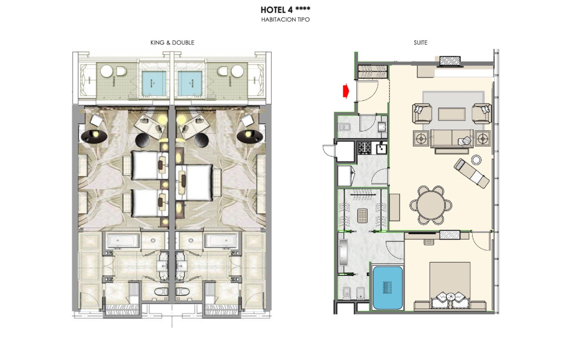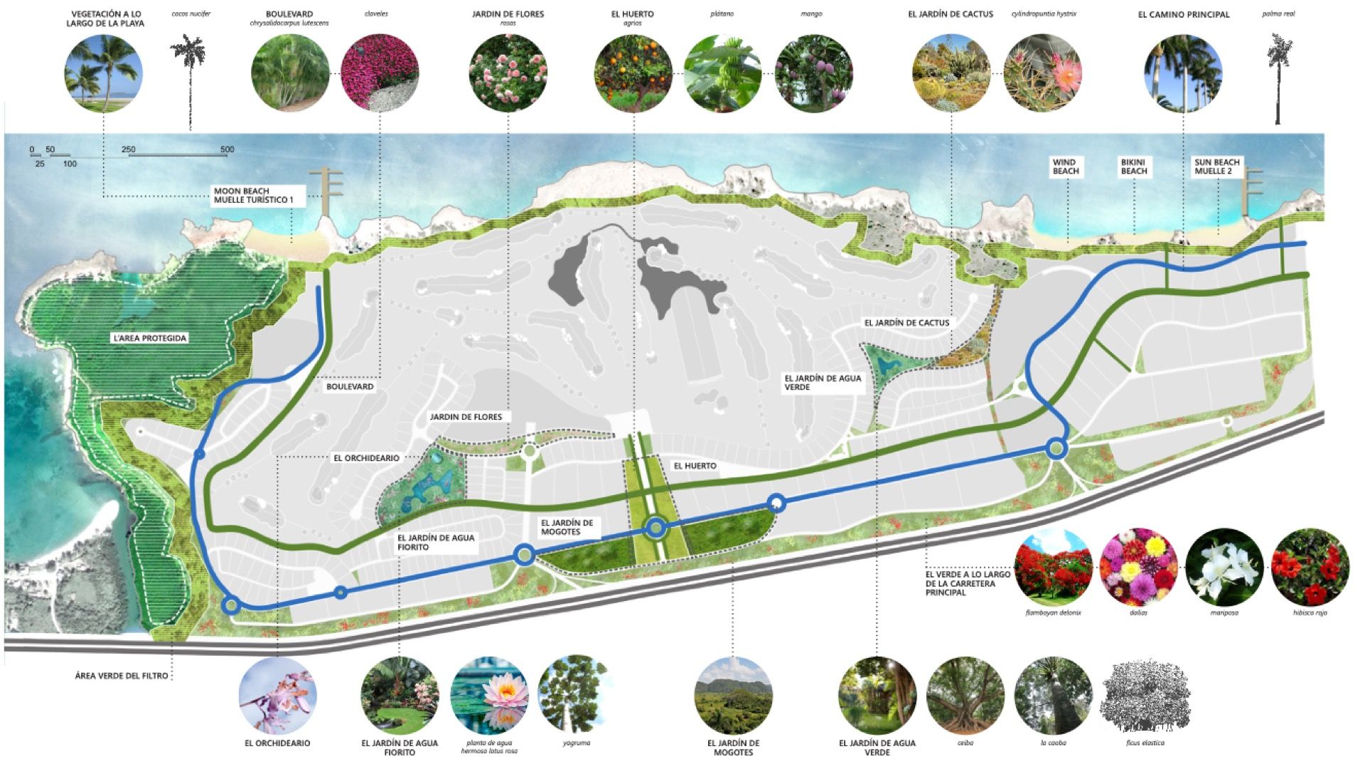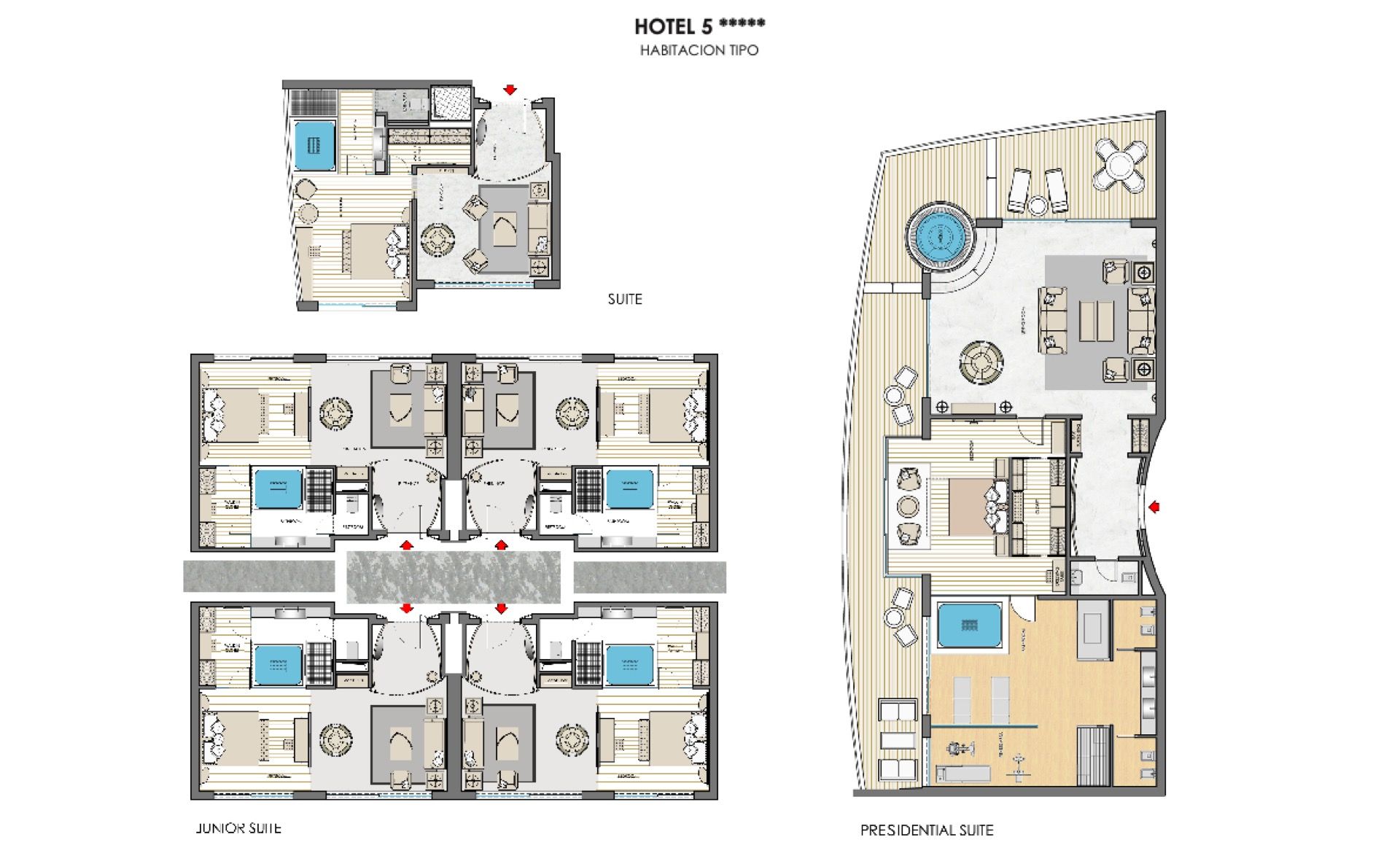 Campo da Golf (18 buche), Hotel 4 stelle (400 camere), Hotel 5 stelle (300 camere), Hotel di lusso 5 stelle (120 camere), Sala Conferenze (400 posti), Spa, Centro Commerciale, Parcheggio, 4 Ville sulla spiaggia, 2070 Appartamenti, 869 Ville, Area verde di 4.10 ha.